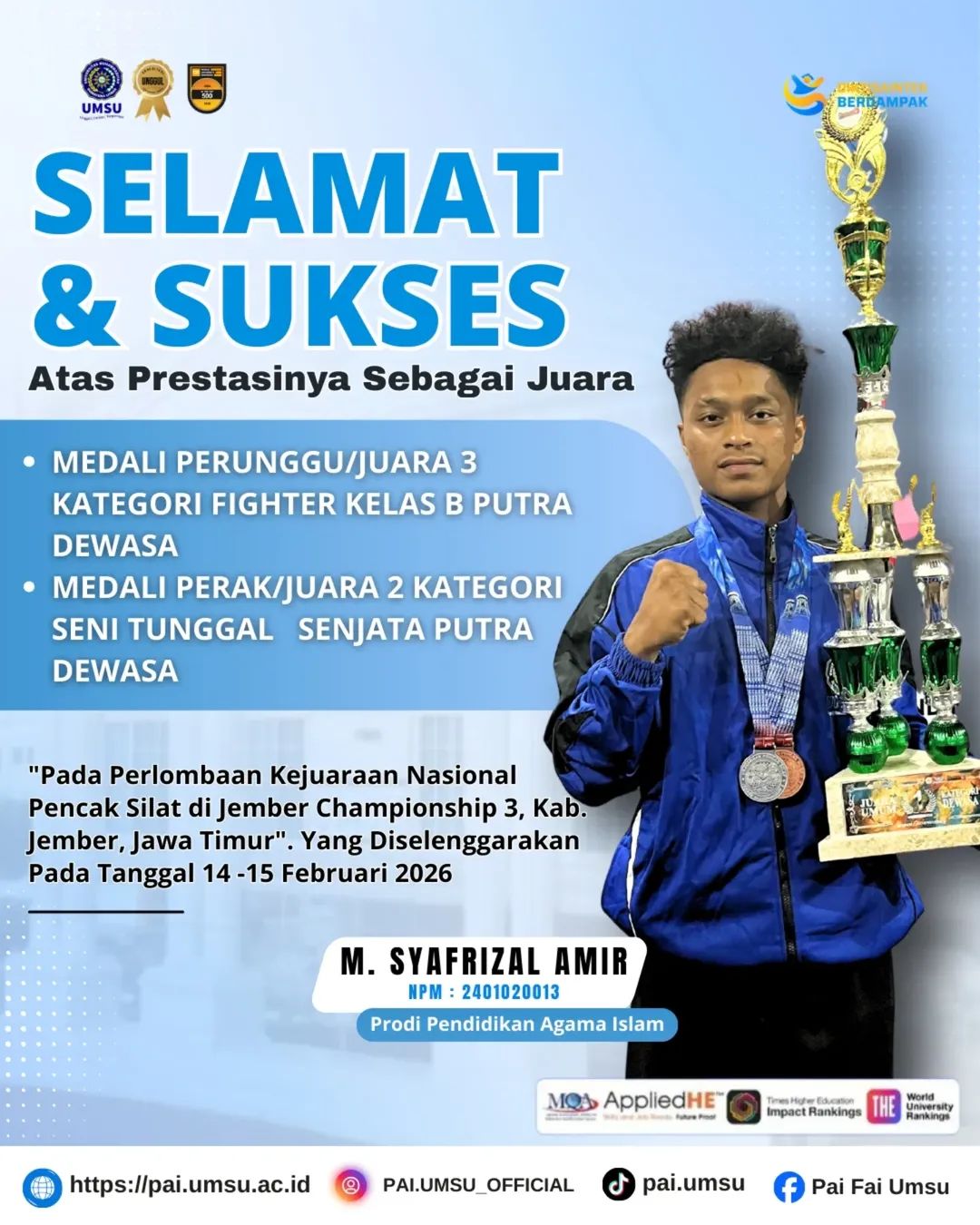 Jember — Prestasi membanggakan kembali ditorehkan oleh mahasiswa Program Studi Pendidikan Agama Islam (PAI) Universitas Muhammadiyah Sumatera Utara. Salah satu mahasiswanya, M. Syafrizal Amin, berhasil meraih medali perunggu dalam ajang kejuaraan Pencak Silat yang diselenggarakan di Jember.