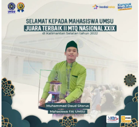 – Muhammad Daud Sitorus, mahasiswa Universitas Muhammadiyah Sumatera Utara (UMSU), berhasil meraih juara terbaik II dalam Musabaqah Tilawatil Qur’an (MTQ) Nasional ke-XXIX yang diadakan di Kalimantan Selatan pada tahun 2022. Prestasi gemilang ini menjadi kebanggaan bagi Daud dan seluruh civitas akademika UMSU, mencerminkan kualitas dan potensi mahasiswa dalam bidang seni baca Al-Qur’an.